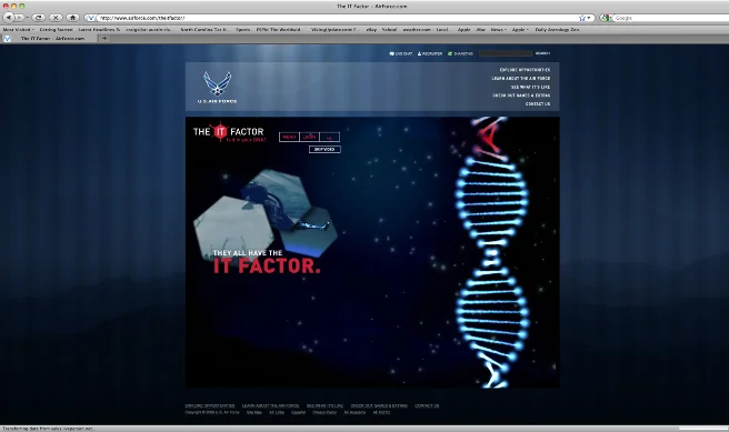 The IT Factor. Do you have what it takes to be a successful member of the US Air Force? This site challenged players to prove their mettle through a series of games and tests. They were able to compare their scores with others in a specific group or against any one who participated. It was also part of an experiential piece that traveled to high schools around the country as well as NASCAR events.